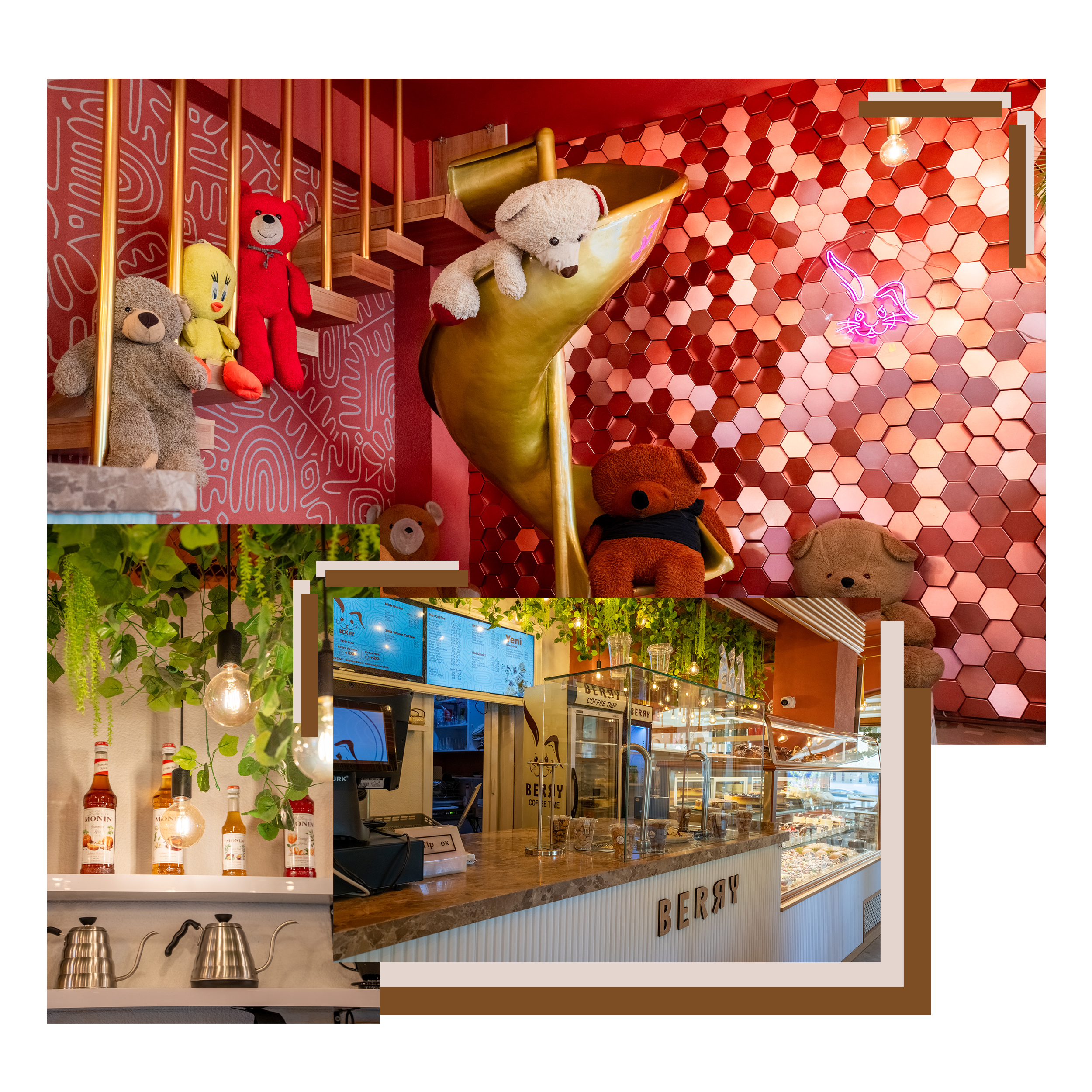 Büyük peluş oyuncakları hangi yaşta sevmeyiz ki? Berry Coffee sadece bir kahve durağı değil konsepti ile içinizdeki çocuğu da seslenerek sıcacık anılar biriktirebileceğiniz yeni bir deneyim. Geniş, ferah ve renklere göre ayrılmış oturma alanlarında ister uzun sohbetlerinizi edip keyifli vakit geçirebilir, ister çalışabilir, isterseniz güne ufak bir mola verebilirsiniz.